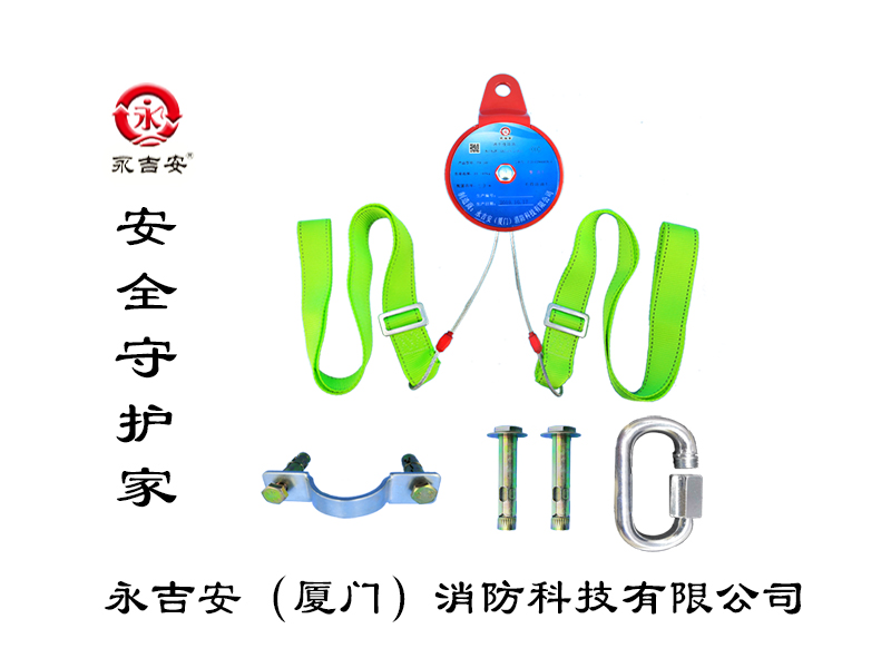逃生緩降器由調(diào)速器、安全鉤、鋼絲繩、安全帶、掛架組成。