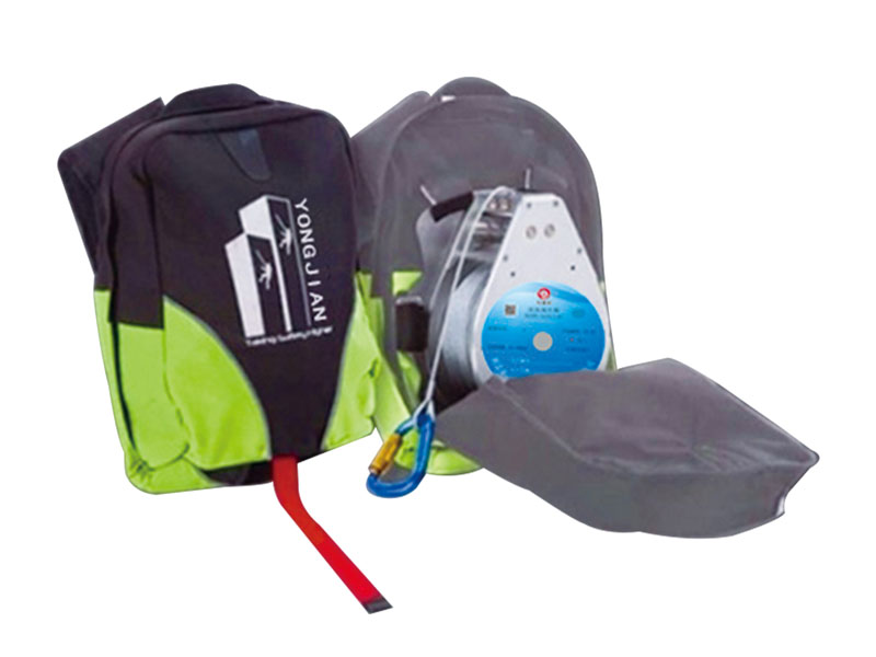 應(yīng)急逃生器(速降器)由調(diào)速器、安全鉤、鋼絲繩、安全帶、背包,調(diào)節(jié)扣,掛架組成。